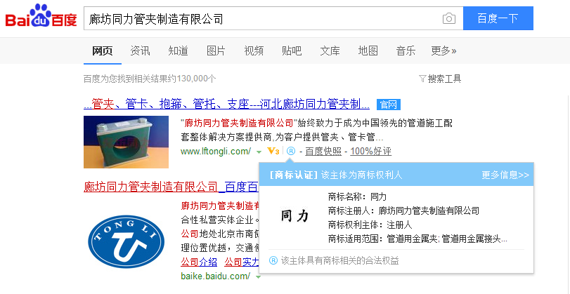 廊坊同力管夾制造有限公司注冊商標順利通過百度信譽商標認證!