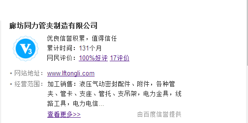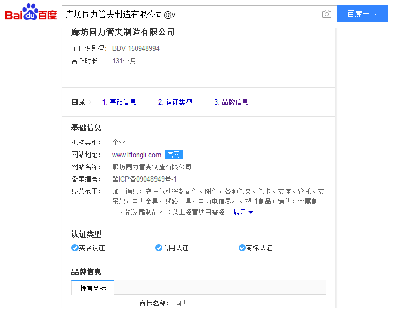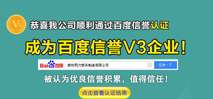 廊坊同力管夾制造有限公司成為百度信譽(yù)V3用戶,合作時(shí)間131個(gè)月。