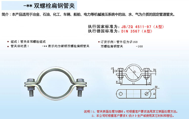產品特點:扁鋼管夾安裝簡便快捷,是管道施工的優良產品。
